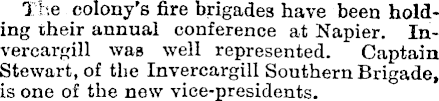 The colony's fire brigades have been holding their annual conference at Napier. Invercargill was well represented. Captain Stewart, of the Invercargill Southern Brigade, is one of the new vice-presidents.