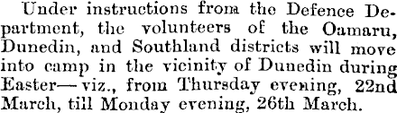 Under instructions from the Defence Department, the volunteers of the Oamaru, Dunedin, and Southland districts will move into camp in the vicinity of Dunedin during Easter —viz., from Thursday evening, 22nd March, till Monday evening, 26th March.
