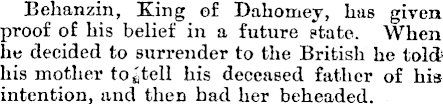 Behanzin, King of Dahomey, has given proof of his belief in a future state. When he decided to surrender to the British he told his mother his deceased father of his intention, and then had her beheaded.