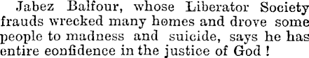 Jabez Balfour, whose Liberator Society frauds wrecked many homes and drove some people to madness and suicide, says he has entire confidence in the justice of God !