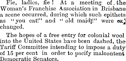 Fie, ladies, fie! At a meeting of. the Woman’s Franchise Association in Brisbane a scene occurred, during which such epithets as “you cat!” and “ old maid|!” were ©kJ changed. The hopes of a free entry for colonial wool into the United States have been dashed, the Tariff Committee intending to impose a dutyof 15 per cent in order to pacify malcontent Democratic Senators.