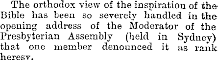 The orthodox view of the inspiration of theBible has been so severely handled in the opening address of the Moderator of the Presbyterian Assembly (held in Sydney) that one member denounced it as rank heresv.