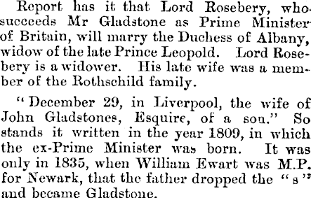 Report has it that Lord Rosebery, whosucceeds Mr Gladstone as Prime Ministexof Britain, will marry the Duchess of Albany, widow of the late Prince Leopold. Lord Rosebery is a widower. His late wife was a member of the Rothschild family. “ December 29, in Liverpool, the wife of John Gladstones, Esquire, of a sou.” So stands it written in the year 1809, in which the ex-Prime Minister was born. It was only in 1835, when William Ewart was M.P. for .Newark, that the father dropped the “ s ” and became Gladstone.