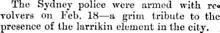 The Sydney police were armed with re» volvers on Eeb. 18 —a grim tribute to the presence of the larrikin element in the city.