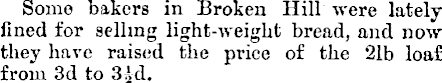 Some bakers in Broken Hill were latelyfined for selling light-weight bread, and now they have raised the price of the 21b loaf from 3d to 3*d.