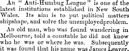 An “ Anti-Humbug League ” is one of the latest institutions established in New South Wales. Its aim is to put political matters shipshape, and solve the unemployedproblem. An old man, who was found wandering in Melbourne, told a constable ho did not know who he was or where he was. Subsequently it was found that his name was James Leaver.