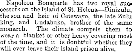 Napoleon Bonaparte has two royal successors on the Island of St. Helena—Dinizulu, the son and heir of Cetewayo, the late Zulu king, and Undabuko, brother of the same monarch. The climate compels them to wear a blanket or other heavy covering most of the time, and it is doubtful whether they will ever leave their island prison alive.