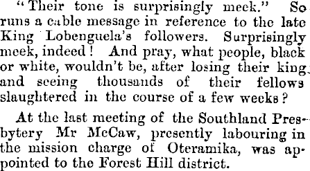 “Their tone is surprisingly meek.” So runs a cable message in reference to the late King Lobeuguela’s followers. Surprisingly meek, indeed ! And pray, what people, black or white, wouldn’t be, after losing their king: and seeing thousands of their fellows slaughtered in the course of a few weeks ? At the last meeting of the Southland Presbytery Mr McCaw, presently labouring in the mission charge of Oteramika, was appointed to the Forest Hill district.