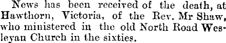 News has been received of the death, at Hawthorn, Victoria, of the Eev. Mr Shaw, who ministered in the old North Hoad Wesleyan Church in the sixties.