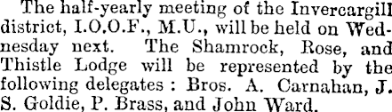The half-yearly meeting of the Invercargill district, 1.0.0. F., M.U., will be held on Wednesday next. The Shamrock, Eose, and Thistle Lodge will be represented by the following delegates : Bros. A. Carnahan, J. S. Goldie, P. Brass, and John Ward.