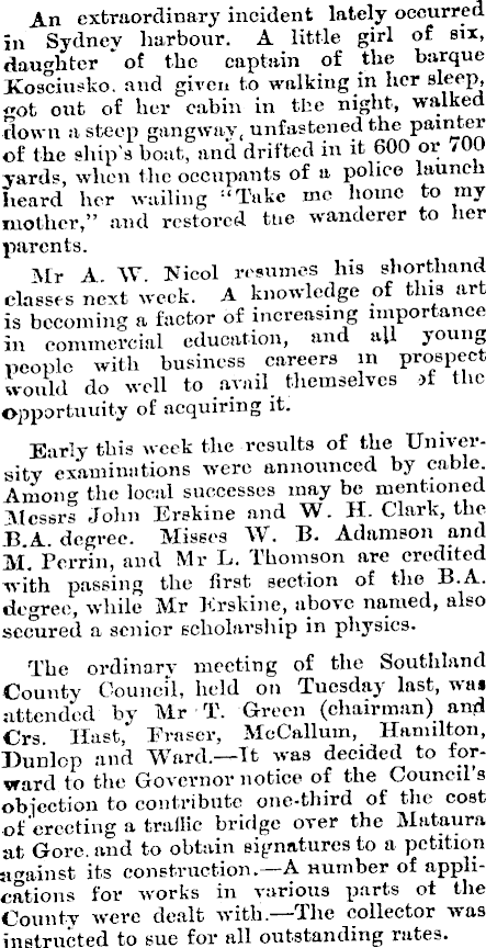 An extraordinary incident lately occurred in Sydney harbour. A little girl of six, daughter *of the captain of the barque Kosciusko, and given to walking hr her s k e P> got out of her cabin in the night, walked down a steep gangway, unfastened the painter of the ship's boat, and drifted in it 600 or /00 yards, when the occupants of a police launch heard her wailing : ‘Takc me home to my mother,” and restored tue wanderer to her parents. i\f r A W Nicol resumes his shorthand classes next week. A knowledge of this art is becoming a factor of increasing importance in commercial education, and all young people with business careers in prospect would do well to avail themselves of the opportunity of acquiring it. Early this week the results of the University examinations were announced by cable. Among the local successes may be mentioned ■Messrs John Erskine and W. H. Clark, the U.A. degree. Misses W. B. Adamson and M. Perrin, and Mr L, Thomson are credited with passing the first section of the B.A. decree, while Mr Erskine, above named, also secured a senior scholarship in physics. The ordinarv meeting of the Southland County Council, held on Tuesday last, was attended by Mr T. Green (chairman) and Crs. Hast, Eraser, MeCallum, Hamilton, Dunlop and Ward. —It was decided to forward to the Governor notice of the Council’s objection to contribute one-third of the cost of erecting a trailic bridge over the Mataura at Gore, and to obtain signatures to a petition against its construction.—A number of applications for works in various parts ot the County were dealt with. The collector was instructed to sue for all outstanding rates.