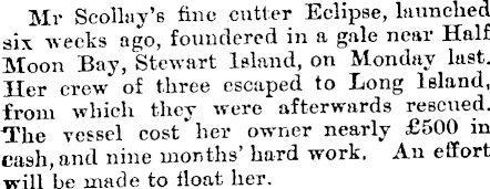 Mr Scolluy’s fine cutter Eclipse, launched six weeks ago, foundered in a gale near Half Moon Bay, Stewart Island, on Monday last. Her crew of three escaped to Long Island, from which they were afterwards rescued. The vessel cost her owner nearly £SOO in cash, and nine months’ hard work. An effort will be made to float her.