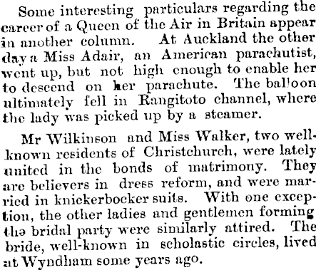 Some interesting particulars regarding the career of a Queen of the Air in Britain appear in another column. At Auckland the other day a Miss Adair, an American parachutist, went up, but not high enough to enable her to descend on ker parachute. The balloon ultimately fell in Rangitoto channel, where the lady was picked up by a steamer. Mr Wilkinson and Miss Walker, two wellknown residents of Christchurch, were lately united in the bonds of matrimony. They are believers in dress reform, and were married in knickerbocker suits. With one exception, the other ladies and gentlemen forming the bridal party were similarly attired. The bride, well-known in scholastic circles, lived sit Wyndham some years ago.