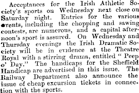 Acceptances for tbe Irisli Athletic Society's sports on Wednesday next close on Saturday night. Entries for the various •vents, including the chopping and sawing contests, arc numerous, and a capital afternoon’s sport is assured. On Wednesday and Thursday evenings the Irish Dramatic Society will be in evidence at the Theatre lloyal with a stirring drama, entitled “ Peep o’ Day.” The handicaps for the Sheffield Handicap are advertised in this issue. The llailway Department also announce the issue of cheap excursion tickets in connection with the sports.
