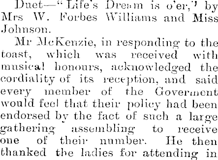 Duet—“ Life's Dre;>m is o’er,’ , by Mrs W. Forbes Williams and Miss •Johnson. Mr McKenzie, in responding’ to the toast, which was received with musical honours, acknowledged the cordiality of its reception, and said every member of the Goverment would feel that their policy had been endorsed by the fact of such a larg-e gathering assembling- to receive one of their number. He then thanked the ladies for attending in