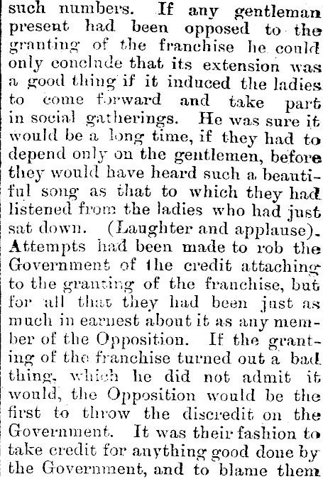 such numbers. If any gentleman present had been opposed to the granting of the franchise he could only conclude that its extension was a good thing if it induced the ladies to come forward and take part in social gatherings. He was sure it would be a long time, if they had to depend only on the gentlemen, before they would have heard such a, beautiful song as that to which they had listened from the ladles who had just sat down. (Laughter and apjalause). Attempts had been made to rob the Government of 1 lie credit attaching to the granting of the franchise, but for all that they had been just as much in earnest about it as any member of the Opposition. If the granting of the franchise turned out a bad thing, which he did not admit it , would, the Opposition would be the first to throw the discredit on the Government. It was their fashion to take credit for anything good done by the Government, and to blame them