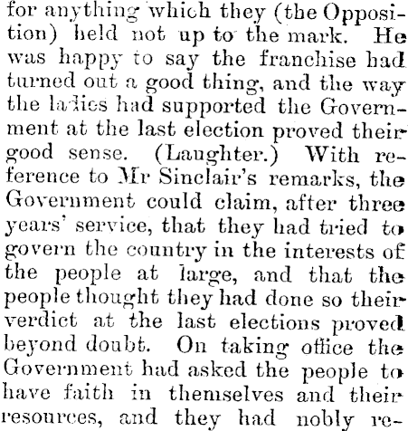 for anything which they (the Opposition) held not up to the mark. He was happy to say the franchise had turned out a good thing, and the way the ladies had supported the Government at the last election proved theirgood sense. (Laughter.) With reference to Hr Sinclair’s remarks, the Government could claim, after three years’ service, that they had tried to govern the country in the interests of the people at large, and that the people thought they had done so theirverdict at the last elections proved beyond doubt. On taking office the Government had asked the people te have faith in themselves and their resources, and they had nobly re-