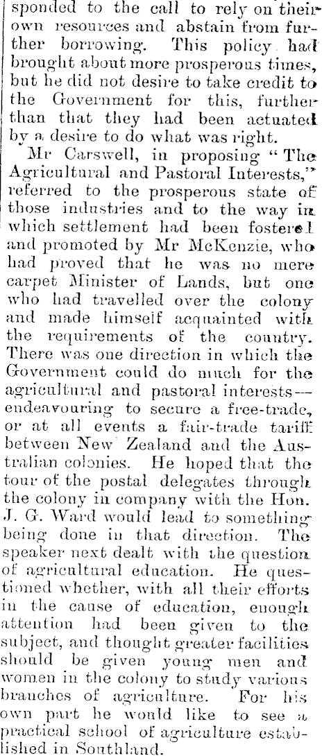 sponded to the call to rely on their own resources and abstain from further borrowing. This policy, had brought about more prosperous times, but he did not desire to take credit to the Government for this, further than that they had been actuated by a desire to do what was right. Mr Carswell, in proposing “ The Agricultural and Pastoral Interests,’* referred to the prosperous state of those industries and to the way ire. which settlement had been fostered and promoted by Mr McKenzie, who had proved that he was no mere carpet Minister of Lands, but one who had travelled over the colony and made himself acquainted with the requirements of the country. There was one direction in which the Government could do much for the agricultural and pastoral interests endeavouring to secure a free-trade, or at all events a fair-trade tariff between New Zealand and the Australian colonies. He hoped that the tour of the postal delegates through the colony in company with the Hon. J. G. Ward would lead to somethingbeing done in that direction. The speaker next dealt with rhe question, of agricultural education. He questioned whether, with all their eftoi-ts in the cause of education, enoug-h attention had been given to the subject, and thought greater facilities should be given young men and. women in the colony to study various branches of agriculture. For his own part he would like to see a practical sciiool of agriculture established in Southland.