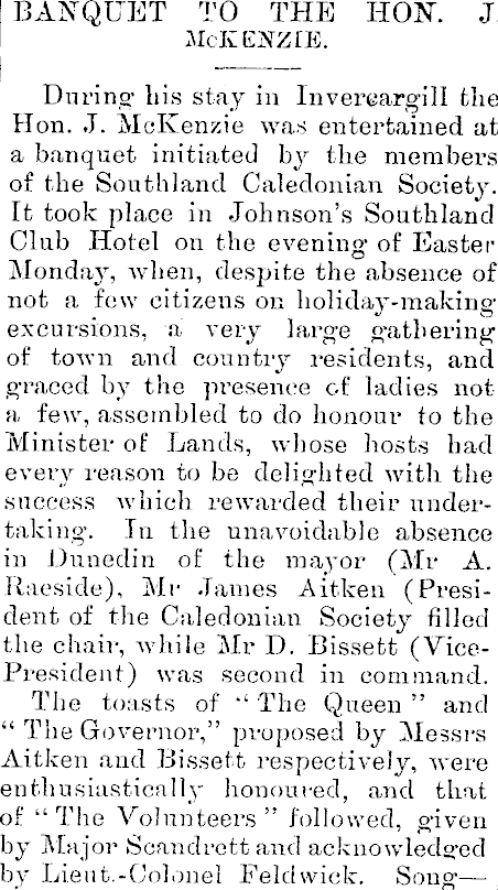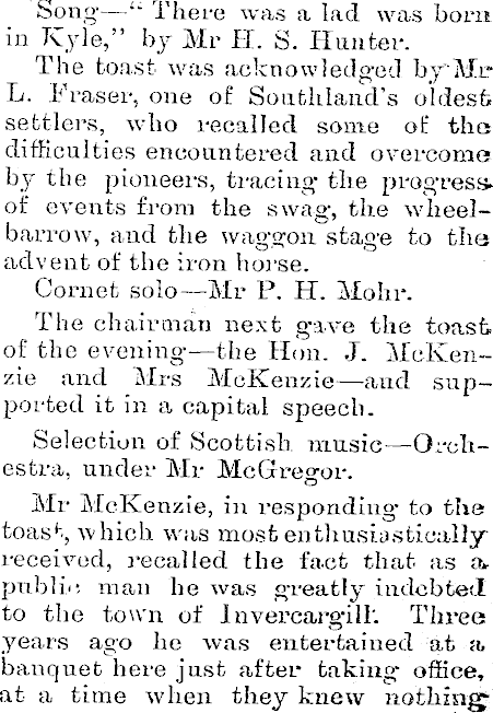 Song 1 — L There was a lad was born in Kyle,” by Mr IT. S. Hunter. The toast was acknow 1 edged by"Mr L. F raser, one of Southland’s oldest, settlers, who recalled some of the difficulties encountered and overcome by the pioneers, tracing- the progress, of events from the swag - , the wheelbarrow, and the waggon stage to the advent of the iron horse. Cornet solo—Mr P. H. Mohr. The chairman next gave the toast, of the evening—the Hon. J. McKenzie and Mrs McKenzie—and supported it in a capital speech. Selection of Scottish music—Orchestra, under Mr McGregor. Mr McKenzie, in responding- to the toast, which was most enthusiastically received, recalled the fact that as a. public man he was greatly indebted to the town of Invercarg-ilh Three years ago bo was entertained at a. banquet here just after taking- office, at a time when they knew nothing-'