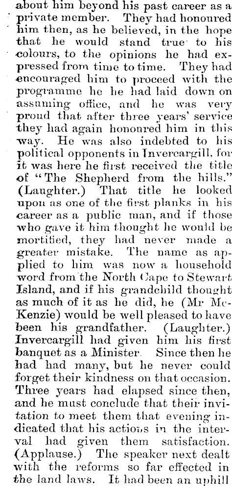 about him beyond his past career as a private member. They had honoured him then, as he believed, in the hope that he would stand true to his colours, to the opinions he had expressed from time to time. They had ■encouraged him to proceed Avith the programme he he had laid down on assuming office, and he was A r ery proud that after three years’ service they had again honoured him in this way. He was also indebted to his political opponents in Invercargill, for it was here he first received the title of “ The Shepherd from the hills.” (Laughter.) That title he looked upon as one of the first planks in his career as a public man, and if those who gave it him thought he would be mortified, they had never made a greater mistake. The name as applied tp him was now a household word from the North Cape to Stewart Island, and if his grandchild thought as much of it as he did, he (Mr McKenzie) would he well pleased to have been his grandfather. (Laughter.) Invercargill had given him his first banquet as a Minister. Since then he bad had many, but he never could forget their kindness on that occasion. Three years had elapsed since then, and he must conclude that their invitation to meet them that evening indicated that his actio'os in the interval had given them satisfaction. (Applause.) The speaker next dealt with the reforms so far effected in the land luavs. It had been an uphill