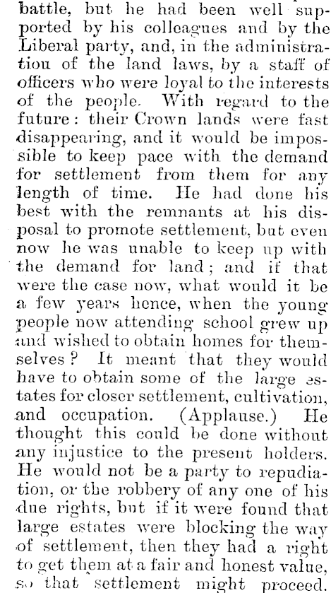 battle, but he had been well supported by his colleagues and by the Liberal party, and, in the administratiou of the land laws, by a staff of officers who were loj r al to the interests of the people. With regard to the future ; their Crown lands were fast disappearing, and it would be impossible to keep pace with the demand for settlement from them for any length of time. He had done his best with the remnants at his disposal to promote settlement, but even now he was unable to keep up with the demand for land; and if that were the case now, what would it be a few years hence, when the young people non- attending school grew up and wished to obtain homes for themselves P It meant that they would have to obtain some of the large estates for closer settlement, cultivation, .and occupation. (Applause.) He thought this could be done without any injustice to the present holders. He would not be a party to repudiation, or the robbery of any one of his due rights, but if it were found that large estates were blocking the way of settlement, then they had a right to get them at a fair and honest value, ao that settlement might proceed.