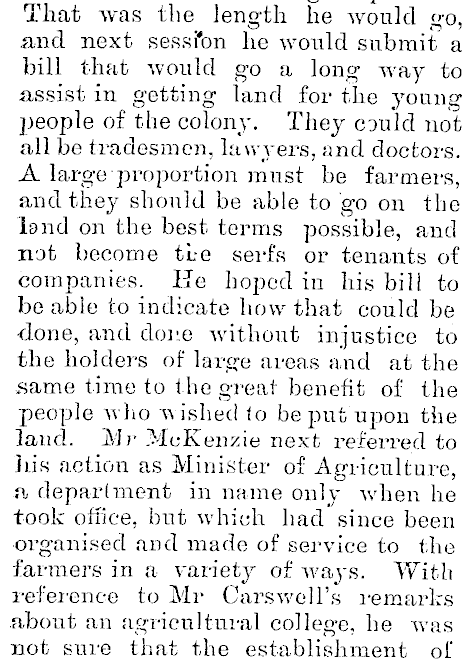 That was the length he would go, and next session he would submit a bill that would go a long way to assist in getting land for the young people of the colony. They could not all be tradesmen, lawyers, and doctors. A large proportion must be farmers, and they should be able to go on the land on the best terms possible, and not become tl-e serfs or tenants of companies. He hoped in his bill to be able to indicate how that could be ■done, and done without injustice to the holders of large areas and at the same time to the great benefit of the people Avho wished to be put upon the land. Hr McKenzie next referred to Ids action as Minister of Agriculture, a department in name only when be took office, but wdvich had since been organised and made of service to the farmers in a variety of ways. With reference to Mr Carswell’s remarks about an agricultural college, be was not sure that the establishment of