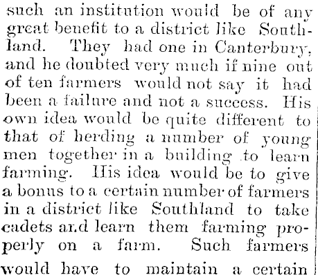 such an institution would be of any great benefit to a district like Southland. They bad one in Canterbury', and he doubted very much if nine out of ten farmers would not say it had been a failure and not a success. His own idea would be quite different to that of herding a number of youngmen together in a building to learn farming. His idea would be to give a bonus to a certain number of farmers in a district like Southland to take cadets and learn them farming properly on a farm. Such farmers would have to maintain a certain