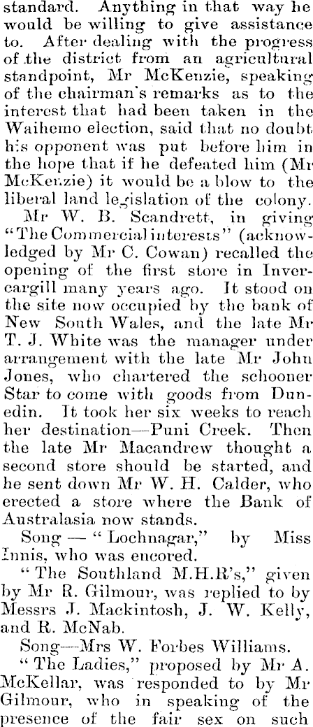 standard. Anything in that way he would be willing to give assistance to. After dealing Avith the progress of .the district from an agricultural standpoint, Mr McKenzie, speaking of the chairman’s remarks as to the interest that had been taken in the Waihemo election, said that no doubt his opponent Avas put before him in the hope that if he defeated him (Mr McKenzie) it Avould bo a blow to the liberal land legislation of the colony. Mr W. B. Scandrett, in giving “The Commercial interests” (acknowledged by Mr C. Cowan) recalled the opening of the first store in Invercargill many years ago. It stood on the site now occupied by the bank of New South Wales, and the late Mr T. J. White Avas the manager under arrangement with the late Mr John Jones, Avho chartered the schooner Star to come Avith goods from Dunedin. It took her six weeks to reach her destination—Puni Creek. Then the late Mr Macandrcw thought a second store should be started, and he sent down Mr W. H. Calder, Avho erected a store Avhere the Bank of Australasia now stands. Song Innis, Avho Avas encored. “ The Southland M.H.R’s,” hy Mr R. Gilmour, Avas replied to by Messrs J. Mackintosh, J. W. Kelly, and R. McNab. Song—Mrs W. Forbes Williams. “ The Ladies,” proposed by Mr A. McKellar, was responded to by Mr Gilmour, Avho in speaking of the presence of the fair sex on such
