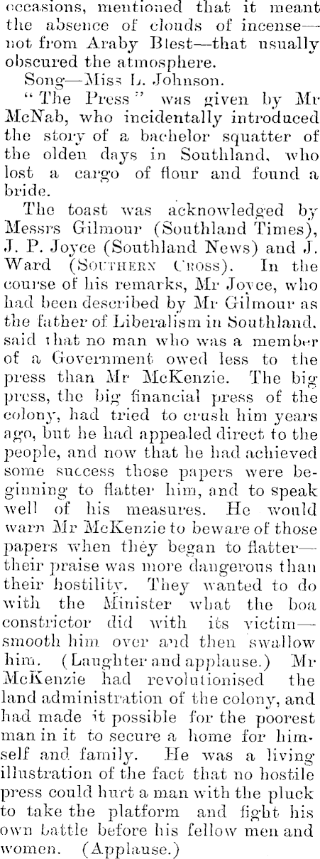 occasions, mentioned that it meant the absence of clouds of incense—not from Araby Blest—that usually obscured the atmosphere. Song—Miss Ij. Johnson. “ The Press was given by Mr McHab, who incidentally introduced the story of a bachelor squatter of the olden days in Southland, who lost a cargo of flour and found a bride. The toast was acknowledged by Messrs Gilraour (Southland Times), J. P. Joyce (Southland Hews) and J. Ward (Southern' Cross). In the course of his remarks, Mr Jovce, who had been described by Mr Gilrnour as the father of Liberalism in Southland, said that no man who was a member of a Government owed less to the press than Mr McKenzie. The big press, the big financial press of the colony, had tried to crash him years ago, but he had appealed direct to the people, and now that he had achieved some success those papers were beginning to flatter him, and to speak well of his measures. He would warn Mr McKenzie to beware of those papers when they began to flatter—their praise was more dangerous than their hostility. They wanted to do with the Minister what the boa constrictor did 'with its victim — smooth him over and then swallow him. ( Laughter and applause.) Mr McKenzie had revolutionised the land administration of the colony, and had made it possible for the pooi’est man in it to secure a home for himself and family. He was a living’ illustration of the fact that no hostile press could hurt a man with the pluck to take the platform and fight his own battle before his fellow men and women. (Applause.)