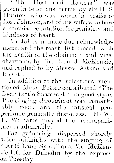 “ The Host and Hostess” was given in felicitous terms by Mr H. S. Hunter, who Avas ay arm in praise of host Johnson, and of bis wife.Avbo bore a colonial reputation for geniality and kindness of heart. Mr Johnson made due acknowledgment, and the toast list closed with the health of the chairman and \riceehairman, by the Hon. J. McKenzie, and replied to by Messrs Aitken and Bissett. In addition to the selections mentioned, Mr A. Potter contributed “The Dear Little Shamrock ” in good style. The singing throughout was remarkably good, and the musical programme generally first-class. Mr W. P. Williams played the accompaniments admirably. The gathering dispersed shortly after midnight Avith the singing of. “ Anld Lang Syne,” and Mr McKenzie left for Dunedin by the express j on Tuesday. j