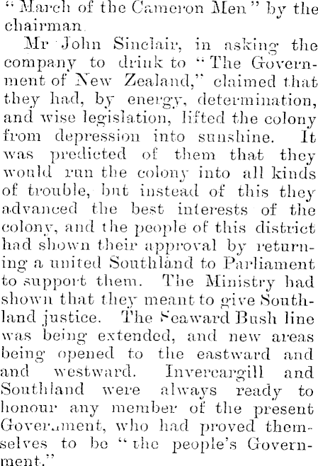 March of the Cameron Men ” by the chairman Mr 'John Sinclair, in asking- the company to drink to The Government of New Zealand,” claimed that they had, by energy, determination, and wise legislation, lifted the colony from depression into sunshine. It was predicted of them that they would run the colony into all kinds of trouble, but instead of this they advanced the best interests of the colony, and the people of this district had shown their approval by returning a united Southland to Parliament to support them. The Ministry had shown that they meant to give Southland justice. The Seaward Bush line was being extended, and new areas being opened to the eastward and and westward. Invercargill and Southland were always ready to honour any member of the present Government, who had proved themselves to bo “ the people’s Government.”