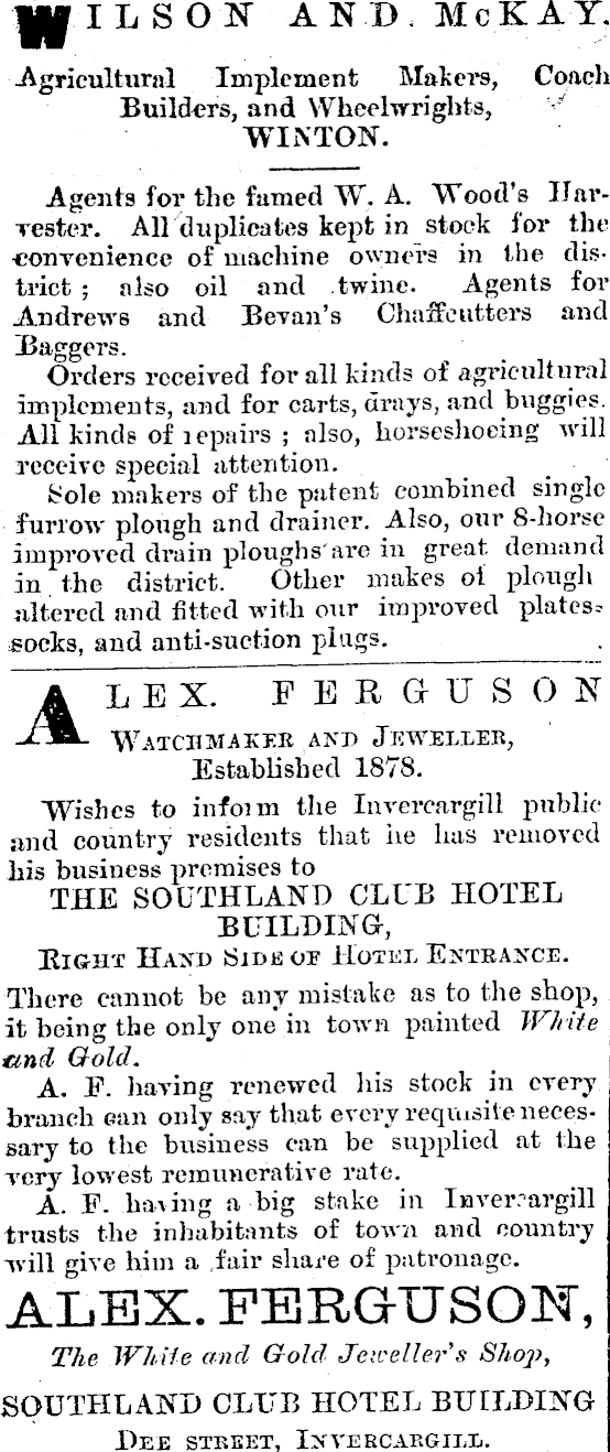 ■WILSON AND. MoKAT. -Agricultural Implement Makers, Coach Builders, and Wheelwrights, WINTON. Agents for the famed W. A, "Wood’s llarrester. Air duplicates kept in stock ior the ■convenience of machine owners in the district ; also oil and .twine. Agents for Andrews and Sevan's Chaffc utters and Baggers. Orders received for all kinds of agricultural implements, and for carts, drays, and buggies. All kinds of lepairs ; also, horseshoeing will receive special attention. Sole makers of the patent combined single furrow' plough and drainer. Also, onr 8-horse improved drain plough s'are in great demand in the district. Other makes of plough altered and fitted with our improved plates? socks, and anti-suction plugs. Alex, i br&uson Watchmaker and Jeweller, Established 1878. Wishes to inf ol m the Invercargill public and country residents that he has removed his business premises to THE SOUTHLAND CLUB HOTEL BUILDING-, Bight Hand Side oe Hotel Entrance. There cannot be any mistake as to the shop, it being the only one in town painted White tind, Gold. A, E. having renewed his stock in every branch can only say that every requisite necessary to the business can be supplied at the very lowest remunerative rate. A. E. having a big stake in Invercargill trusts the inhabitants of town and country will give him a fair share of patronage. ALEX. FERGUSON, The White and Gold Jeweller's Shop, SOUTHLAND CLUB HOTEL BUILDING Dee street, Invercargill.