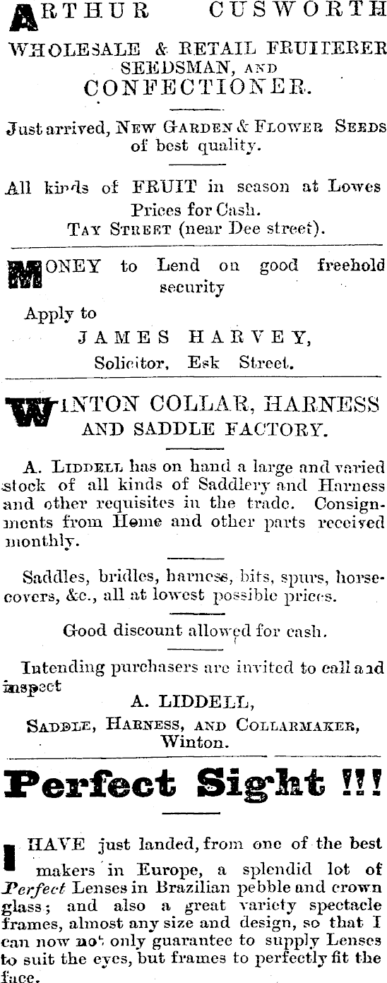 CUSWORTI WHOLESALE & DETAIL FEUirEEEE SEEDSMAN, and CONFECTIONER. Just arrived. New Garden & Flower Seeds of best quality. All birds of FEUIT in season at Lowes Prices for Cash. Tay Street (near Dee street). air wst ONEY to Lend on good freehold security Apply to JAMES II AEV EY, Solicitor, Esk Street. w iNTON COLLAR, HARNESS AND SADDLE EACTOEY. A. Liddell has on hand a large and varied stock of all kinds of Saddlery and Harness and other requisites in the trade. Consignments from Heme and other parts received monthly. Saddles, bridles, harness, bits, spin’s, horsecovers, Ac., all at lowest possible prices. Good discount allowed for cash. Intending purchasers arc invited to call aid inspect A. LIDDELL, Saddle. Harness, and Collarmakeb, Winton. Perfect Sig*kt !!! I HAVE just landed, from one of the best makers in Europe, a splendid lot of JPcrfect Lenses in Brazilian pebble and crown glass; and also a great variety spectacle frames, almost any size and design, so that I can now no I *, only guarantee to supply Lenses to suit the eyes, but frames to perfectly fit the face.