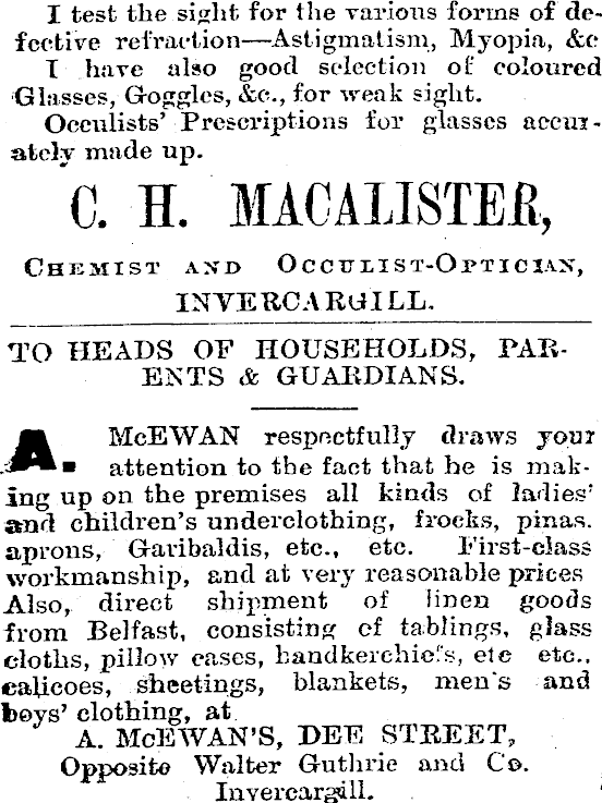 I test the sight for the various forms of defective refraction —Astigmatism, Myopia, &c I have also good selection of coloured 'Glasses, Goggles, &c., for weak sight. Occulists’ Prescriptions for glasses accurately made up. Chkmist and Occitxist-Opticiax, IN YE RCA EG ILL. TO HEADS OF HOUSEHOLDS, TALENTS & GUARDIANS. AMcEWAN respectfully draws jour ■ attention to the fact that be is making up on the premises all kinds of ladies’ and cbildi’en’s underclothing, frocks, pinas. aprons, Garibaldis, etc., etc. First-class workmanship, and at very reasonable prices Also, direct shipment of linen goods from Belfast, consisting cf tablings, glass j cloths, pillow cases, handkerchiefs, etc etc., calicoes, sheetings, blankets, men’s and boys’ clothing, at A. McEWAN’S, DEE STREET, Opposite Walter Guthrie and Co. Invercargill.