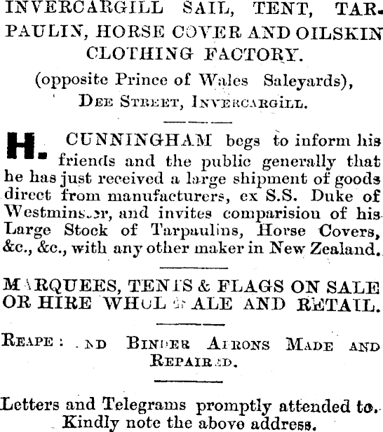 INVERCARGILL SAIL, TENT, TARPAULIN, HORSE COYER AND OILSKIN CLOTHING FACTORY. (opposite Prince of Wales Saleyards), Dee Street, Invekcaeglli,. LX CUNNINGHAM begs to inform his ■ friends and the public generally that he has just received a large shipment of goods direct from manufacturers, ex S.S. Duke of Westminster, and invites comparisiou of his Large Stock of Tarpaulins, Horse Covers, &c., &c,, with any other maker in New Zealand. MARQUEES, TENTS & FLAGS ON SALE OR HIRE WHuL L ALE AND RETAIL. Reape: . 2sd Biniek Ai-eons Made and Repaired. Letters and Telegrams promptly attended to, , Kindly note the above address.