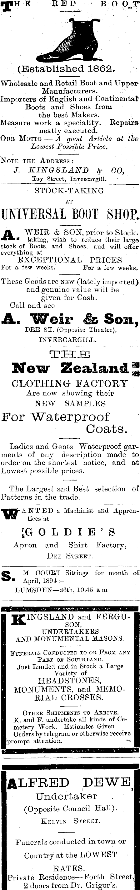 JL (Established 1862. Wholesale and Retail Boot and UpperManufacturers. Importers of English and Continental Boots and Shoes from the best Makers. Measure work a speciality. Repairsneatly executed. Our Motto A good Article at theLowest Possible Price. Note the Address : J. KINGBLANB 8r GO, Tay Street, Invercargill. STOCK-TAKING at UNIVERSAL BOOT SHOP. A WEIR & SON, prior to Stock- ■ taking, wish to reduce their large stock of Boots, and Shoes, and will offer everything at EXCEPTIONAL PRICES For a few weeks. For a few weeks. These Goods are new (lately imported) and genuine value will be given for Cash. Call and see A. Weir & Son, DEE ST. (Opposite Theatre), INVEECAEGILL. Tll£] ‘ New Zealand J CLOTHING FACTORY Are now showing their NEW SAMPLES For Waterproof Coats. Ladies and Gents Waterproof garments of any description made to order on the shortest notice, and at Lowest possible prices. The Largest and Best selection of Patterns in the trade. WANTED a Machinist and Apprentices at [GOLDIE’S Apron and Shirt Factory, Dee Street. SM. COUET Sittings for month of ■ April, 1891 LUMSDEN—26th, 10.45 a.m KINGSLAND and FERGUSON, UNDEETAKEES AND MONUMENTAL MASONS. Funeeaxs Conducted to oe From any Past oe Southland. Just Landed and in Stock a Large Variety of HEADSTONES, MONUMENTS, and MEMORIAL CROSSES. Othee Shipments to Aeeive. K. and F. undertake all kinds of Cemetery Work. Estimates Given Orders by telegram or otherwise receive prompt attention. ALFRED DEWB j Undertaker (Opposite Council Hall). Kelvin Street. Funerals conducted iutown or Country at the LOWEST RATES. Private Residence —Forth Street, 2 doors from Dr. Grigor’s.