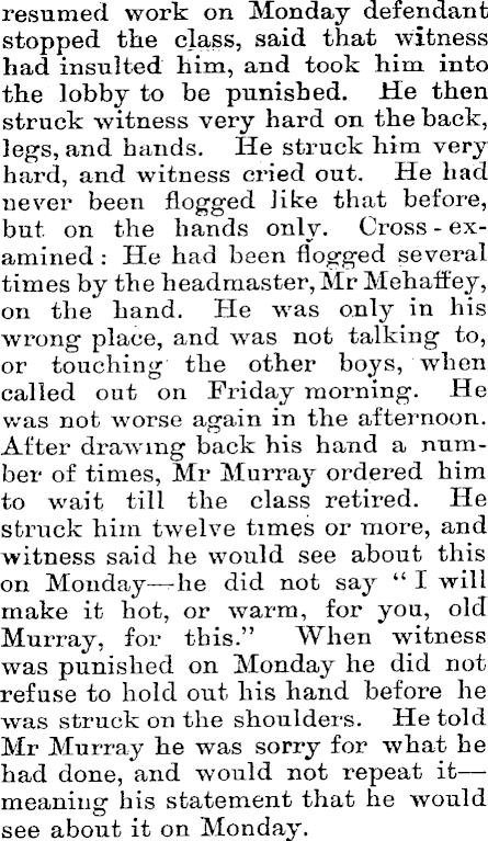 resumed work on Monday defendant stopped the class, said that witness had insulted him, and took him into the lobby to be punished. He then struck witness very hard on the hack, legs, and hands. He struck him very hard, and witness cried out. He had never been flogged like that before, but on the hands only. Cross - examined : He had been flogged several times by the headmaster,Mr Mehaffey, on the hand. He was only in his wrong place, and was not talking to, or touching the other boys, when called out on Friday morning. He was not worse again in the afternoon. After drawing back his hand a number of times, Mr Murray ordered him to wait till the class retired. He struck him twelve times or more, and witness said he would see about this on Monday—die did not say “ I will make it hot, or warm, for you, old Murray, for this.” When witness was punished on Monday he did not refuse to hold out his hand before he was struck on the shoulders. He told Mr Murray he was sorry for what he had done, and would not repeat it—meaning his statement that he would see about it on Monday.