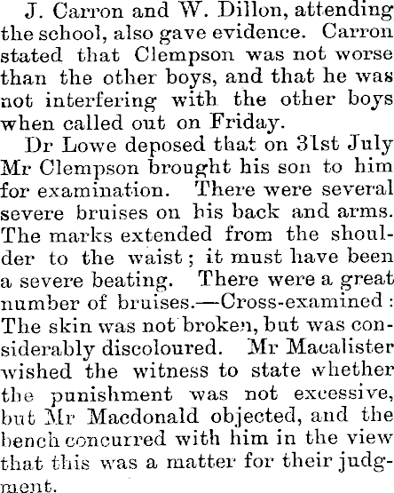 J. Carron and W. Dillon, attending the school, also gave evidence. Carron stated that Clempson was not worse than the other boys, and that he was not interfering with the other boys when called out on Friday. Dr Lowe deposed that on 31st July Mr Clempson brought his son to him for examination. There were several severe bruises on his back and arms. The marks extended from the shoulder to the waist; it must have been a severe beating. There were a great number of bruises. —Cross-examined : The skin was not broken, but was considerably discoloured. Mr Macalister wished the witness to state whether the punishment was not excessive, but Mr Macdonald objected, and the bench concurred with him in the view that this was a matter for their judgment.