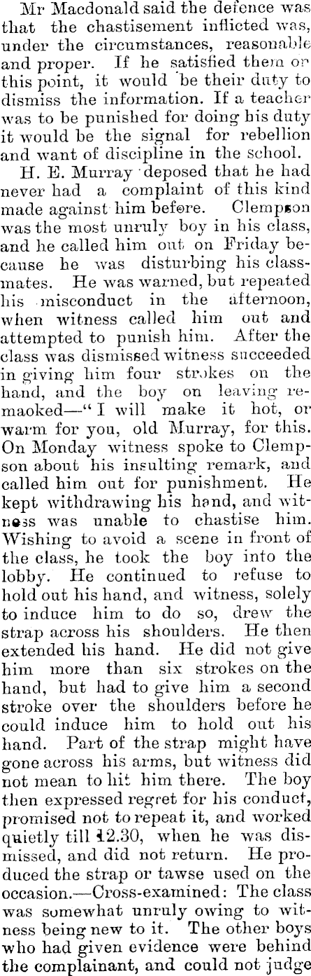 Mr Macdonald said the defence was that the chastisement inflicted was, under the circumstances, reasonable and proper. If he satisfied them or this point, it would he their duty to dismiss the information. If a teacher was to be punished for doing his duty it would be the signal for rebellion and want of discipline in the school. H. E. Murray deposed that he had never had a complaint of this kind made against him before. Clempson was the most unruly boy in his class, and he called him out on Friday because he was disturbing his classmates. He was warned, but repeated his misconduct in the afternoon, when witness called him out and attempted to punish him. After the class was dismissed witness succeeded in giving him four strokes on the hand, and the boy on leaving remaoked —“ I will make it hot, or warm for you, old Murray, for this. On Monday witness spoke to Clempson about his insulting remark, and called him out for punishment. He kept withdrawing his hand, and witness was unable to chastise him. Wishing to avoid a scene in front of the class, he took the boy into the lobby. He continued to refuse to hold out his hand, and witness, solely to induce him to do so, drew the strap across his shoulders. He then extended his hand. He did not give him more than six strokes on the hand, but had to give him a second stroke over the shoulders before he could induce him to hold out his hand. Part of the strap might have gone across his arms, but witness did not mean to hit him there. The boy then expressed regret for his conduct, promised not to repeat it, and worked quietly till 12.30, when he was dismissed, and did not return. He produced the strap or tawse used on the occasion.—Cross-examined: The class was somewhat unruly owing to witness being new to it. The other boys who had given evidence were behind the complainant, and could not judge