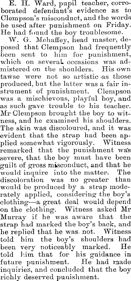 E. H. Ward, pupil teacher, corroborated defendant’s evidence as to Clempson’s misconduct, and the words he used after punishment on Friday. He had found the boy troublesome. W. G. Mehaffey, head master, deposed that Clempson had frequently been sent to him for punishment, which on several, occasions was admistered on the shoulders. His own tawse were not so artistic -as those produced, but the latter was a fair instrument of punishment. Clempson was a mischievous, playful boy, and as such gave trouble to his teacher. Mr Clempson brought the boy to witness, and he examined his shoulders. The skin was discoloured, and it was evident that the strap had been applied somewhat vigorously. Witness remarked that the punishment wa's severe, that the boy must have been guilt of gross misconduct, and that he would inquire into the matter. The discoloration was no greater than would be produced by a strap moderately applied, considering the boy’s clothing—a great deal would depend on the clothing. Witness asked Mr Murray if he was aware that the strap had marked the boy’s back, and he replied that he was. not. Witness told him the boy’s shoulders had been very noticeably marked. He told h.im that for his guidance in future punishment. He had made inquiries, and concluded that the boy richly deserved punishment.