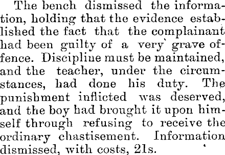 The bench dismissed the information, holding that the evidence established the fact that the complainant had been guilty of a very' grave offence. Discipline must be maintained, and the teacher, under the circumstances, had done his duty. The punishment inflicted was deserved, and the boy had brought it upon himself through refusing to receive the ordinary chastisement. Information dismissed, with costs, 21s.