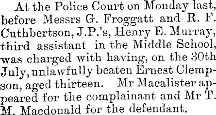 At the Police Court on Monday last, before Messrs G. Froggatt and R. F. Cuthbertson, J.P.’s, Henry E. Murray, third assistant in the Middle School, •was charged with having, on the 80th July, unlawfully beaten Ernest Clerapson, aged thirteen. Mr Macalister appeared for the complainant and Mr T. M. Macdonald for the defendant.