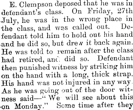E. Clempson deposed that he was in defendant’s class. On Friday, 27th July, he was in the wrong place in the class, and was called out. Defendant told him to hold out his hand and he did so, but dre,v it back again. He was told to remain after the class bad retired, anc. did so. Defendant then punished witness by striking him on the hand with a long, thick strap. His hand was not injured in anyway. As he was going out of the door witness said —“ We will see about this ■on Monday.” Some time after they