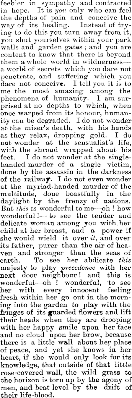 feebler in sympathy and contracted in hope. It is you only who can feel the depths of pain and conceive the way of its healing. Instead of trying to do this you turn away from it, you shut yourselves within your park walls and garden gates ; and you are content to know that there is beyond them aw r hole world in wildnerness—a world of secrets which you dare not penetrate, and suffering which you dare not conceive. I tell you it is to me the most amazing among the phenomena of humanity. I am surprised at no depths to which, when once warped from its honour, humanity can be degraded. Ido not wonder at the miser’s death, with his hands as they relax, dropping gold. I do not wonder at the sensualist’s life, with the shroud wrapped about his feet. Ido not wonder at the singlehanded murder of a single victim, done by the assassin in the darkness of the railway. I do not even wonder at the myriad-handed murder of the multitude, done boastfully in the daylight by the frenzy of nations. Bnt this is wonderful to me—oh ! how wonderful!—- to see the tender and delicate woman among you with, her child at her breast, and a power if she would wield it over it, and over its father, purer than the air of heaven and stronger than the seas of earth. To see her abdicate this majesty to play precedence with her next door neighbour! and this is wonderful —oh ! wonderful, to see her with every innocent feeling fresh within her go out in the morning into the garden to play with the fringes of its guarded flowers and lift their heads when they are drooping with her happy smile upon her face and no cloud upon her brow, because there is a little wall about her place of peace, and yet she knows in her heart, if she would only look for its knowledge, that outside of that little rose-covered wall, the wild grass to the horizon is torn up by the agony of men, and beat level by the drift of their life-blood.