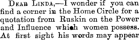 Dbab Linda, —I wonder i£ you can find a corner in the Horae Circle for a quotation from Ruskin on the Power and Influence whi«h women possess. At first sight his words may appear