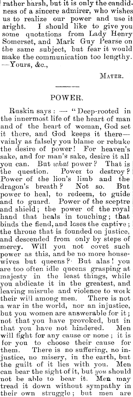 rather harsh, but it is only the candidness of a sincere admirer, who wishes us to realize our power and use it aright. I should like to give you some quotations from Lady Henry Somerset, and Mark Guy Pearse on the same subject, but fear it would make the communication too lengthy. —Yours, &c., Mater. POWER. Ruskin says : the innermost life of the heart of man and of the heart of woman, God set it there, and God keeps it there—vainly as falsely you blame or rebuke the desire of power! For heaven’s sake, and for man’s sake, desire it all you can. But tvhat power ? That is the question. Power to destroy P Power of the lion’s limb and the dragon’s breath ? Not so. But power to heal, to redeem, to guide and to guard. Power of the sceptre and shield; the power of the royal hand that heals in touching; that binds the fiend, and loses the captive ; the throne that is founded on justice, and descended from only by steps of mercy. Will you not covet such power as this, and be no more housewives but queens?' But alas! you are too often idle queens grasping at majesty in the least things, while you abdicate it in the greatest, and leaving misrule and violence to work their will among men. There is not a war in the world, nor an injustice, but you women are answerable for it; not that you have provoked, but in that you have not hindered. Men will fight for any cause or none ; it is for you to choose their cause for them. There is no suffering, no injustice, no misery, in the earth, but the guilt of it lies with you. Men can bear the sight of it, but you should not be able to bear it. Men may tread it down without sympathy in their own struggle ; but men are