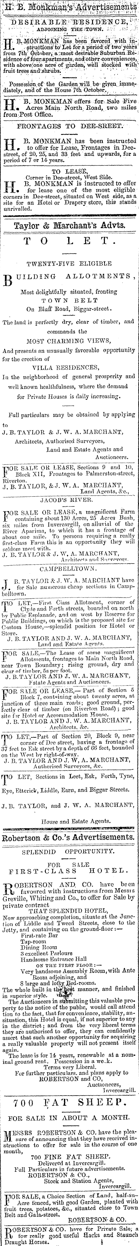 ;H: B. MonkmakV Advertisements DESIRABLE RESIDENCE, 1 * ! ADJOINING THE iTO-vra . ' ' HB.MONOLiN'fias been favored with in- . structions io Let for a period of two yehrs' from 7th October j a 'most desirable Suburban Residence of ibur apartments, and other conveniences with above' one acre of garden, well stocked with" fruit trees and .shrubs. . Posseasion.of ' the Garden tsfill, be giyen immediately, anS of the House 7th. October . T . . HB.: MONKMAN offers for:, Sale Five: • Acres Main North. Road, two miles from-Ppst Office. FRONTAGES TO DEE-SREET. HB. MONKMAN. has been instructed » to offer for Lease, Frontages in Deestreet, of 20, 25, and 33 feet and upwards, for a period of 7 or 14 years. TO LEASE, Corner in Dee-street, West Side. HB. MONKMAN is instructed to offer • for lease one of the most eligible corners in Dee-street, situated on West side, as a site for an Hotel or Drapery store, this stands unrivalled. : Taylor & Marchant's Advts. T~~O iT^E T . TWENTY-FIVE ELIGIBLE T> UILDING ALLOTMENTS, Most delightfully situated, fronting TOWN BELT On Bluff Road, Biggar-street. i The land is perfectly dry, clear of timber, and I commands the MOST CHARMING VIEWS, And presents an unusually favorable opportunity for the erection of VILLA RESIDENCES, In the neighborhood of general prosperity and well known healthfulness, where the demand for Private Houses is daily increasing. Full particulars may be obtained hj applying to J. B. TAYLOR & J. W. A. MARCHANT, Architects, Authorised Surveyors, Land and Estate Agents and Auctioneers. OITSALF, OR LEASE, Sections 9 and 10, Block XII, Frontages to Pahnerston-street, I j!b! TAYLOR, &J. W. A. MARCHANT, Land Agents, &c., JACOB'S MVER. FOR SALE OR LEASE, a magnificent Farm containing about 130 Acres, 25 Acres Bush, six miles from Inverenrgill, on alluvial of the River Aparima, to which it has a frontage of '' about one mile. To persons requiring a really first-class Farm this is an opportunity they will seldom mpet with. J. B. TAYLOK& J. W. A. MARCFTANT, Architects fvnrl S'fvpvnss. CAMPBELLTOWN. JB. TAYLOR & J. W. A. MARCHANT have . for Sale nuaicrous cheap sections in Canopbelltown. , O~ LET, — First. Class Allotment, corner of Cty.te and Forth streets, bounded on north by Public Esplanade, and on west by Reserve for Public Buildings, on which is the proposed site for Custom House,— splendid position for Hotel or J. C B. TAYLOR AND J. W. A.. MARCH ANT, Lnnd find Estate Agents. "nOR SALE,— The Lease of some magnificent J? Allotments, frontages to Main North lioad, near Town Boundary; rising ground, dry and clear of timber, 5s per foot. J. B.TAYLOR AND J. W. A. MARCHANT, F state Agents and Auctioneers. F~OR SALE OETIEASE,— Fart of Section 5 Block 7, contoining about twenty acres, at junction of three main roads; good ground, perfectly clear of timber (on River ton Road) ; good site for Hotel or Accommodation House. J. B. TAYLOR AND J. V?. A.MARCHANT, • Architects. &c. TO LET,— Part of Section 20, Block 9, near JL corner of Dee street, having a frontaga of 37 feet to Esk street by a depth of 66 feet, bounded on the West by rigbt-of-way. J. B. TAYLOR AND J. W, A. MARCHANT, Authorised Surveyors, &c. mo LET, Sections in Leet, Esk, Forth, Tyne, Eye, Etterick, LiJdle, Earn, and Biggar Streets. J. B. TAYLOR, and 3. W. A. MARCHANT, House and Estate Agents. B«uiiuei*J»iufli!i^i*taJ^«g»^ Robertson & Co.'s Advertisements. SPLENDID OPPORTUNITY. FOR SALE FIRST-CLASS HOTEL. ROBERTSON AND. CO. have been favoured with instructions from Messrs Greville, Whiting and Co., to offer for Sale by private contract THAT SPLENDID HOTEL, Now approaching completion, situate at the Junction of Liddle and Tweed Streets, close to the Jetty, and containing on the ground-floor : — First-rate Bar Tap -room Dining Room 3 excellent Parlours i Handsome Entrance Hall [ ON THE PIRST FLOOR : — Very handsome Assembly Room, with Ante | Room, adjoining, and ! 8 large and lofty J§ed-rooms. The whole built in ibe[£ij&t manner, and finished | in superior style. ! The Auctioneers in submitting this valuable proi perty to tha notice of the public, would call attend ' tion to the fact, that for convenience, stability, an- ! situation, this Hotel is equal, if not superior to any iin the district ; and from the very liberal terms I they are authorised to offer, they can confidently assert that such another opportunity for acquiring a really valuable property will not present itself again. The lease is for 14 years, renewable at a nominal ground rent. Possession in a we.k. Terms very Liberal. For further particulars, and plans apply to ROBERTSON and CO, Auctioneers, Invercargill. 700 FAT SHEEP. FOR SALE IN ABOUT A MONTH. MESSRS ROBERTSON & CO. have the pleasure of announcing that they have received instructions to offer for sale in tho course of one month, 700 FINE FAT SHEEP. Delivered at Invercargill. Full Particulars in future advertisements, ROBERTSON & CO., Stock and Station Agents, Invercargill. POR SALE, a. Choice Section of Land, half-an-JU Acre fenced, with good Garden, planted with iruifc trees, potatoes, &c, situated close to Town Belt and Galaxstreet. ROBERTSON- & CO. T>OBERrSON& CO. have for Private Sale; a li few really good useful Sacks and Staunch Draught Horses. §