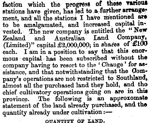 faction which the progress of theae Twum* stations have given, has led to afarther arrangement, ana all the stations I have mentioned are to be amalgamated, and increased capital invested. The. new company is entitled the "New Zealand and Australian Land Company, (Limited)" capital £2,000,000; in sha«Jß of £100 each. lamin a position to say that this enormous capital ■■ has been subscribed without the > company having to resort to the .'. Change ' for assistance, and that notwithstanding that the Company's operations are not restricted to Southland, almost all the purchased land they hold, and tho chief cultivatory operations going on are in thi» province. The following is an approxomate statement of the land already purchased, and the quantity already under cultivation : — QTTAimiY OP LAH3).