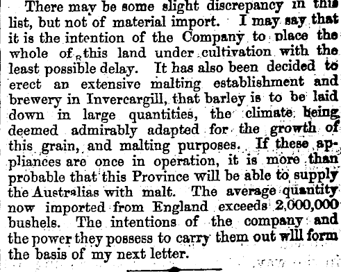 There may he some slight discrepancy m thii list, but not'of material import. I may say that it is the intention of the Company to dace the; whole of R this land under -cultivation /with the least possible delay. It has also been decided tb erect aD extensive malting establishment and brewery in Invereargill, that barley is to be laid' down in large quantities, the : climate; being, deemed admirably adapted for. the growth of this grain,. and malting purposes. .^, these, ap-, pliances are once in operation, it is more ;than' probable thatthis Province will be able to, supply the Auetralias with malt. The average quantity: now imported from England exceeds 1 2,000,000---bushels. The intentions of the company : and the power they possess to carry them out will form the basis of my next letter. , r _.' r ' __... .■ r : . : -.. . -. ... » ' ■'' : ' J" ' . '"'