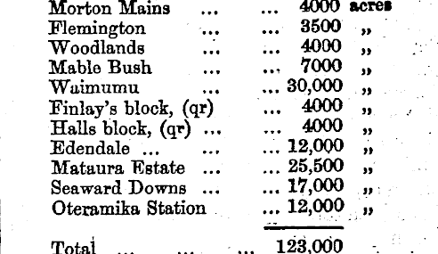 Morton Mains 4000 acrei Flemington 3500 „ Woodlands ... ... 4000 „ Mable Bush , 7000 „ Waimumu 30,000 „ ; Finlay's block, (qr) ... 4000 „ , Halls block, (qr) 4000 „ Edendale 12,000 „ Mataura Estate ... ...25,500 „ Seaward Downs ... ...17,000 » Oteramika Station ... 12,000 » Totai ... 123,000 -. .